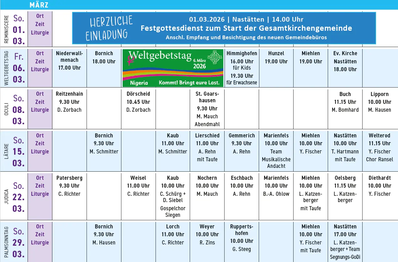 Gottesdienstplan März-Juni
